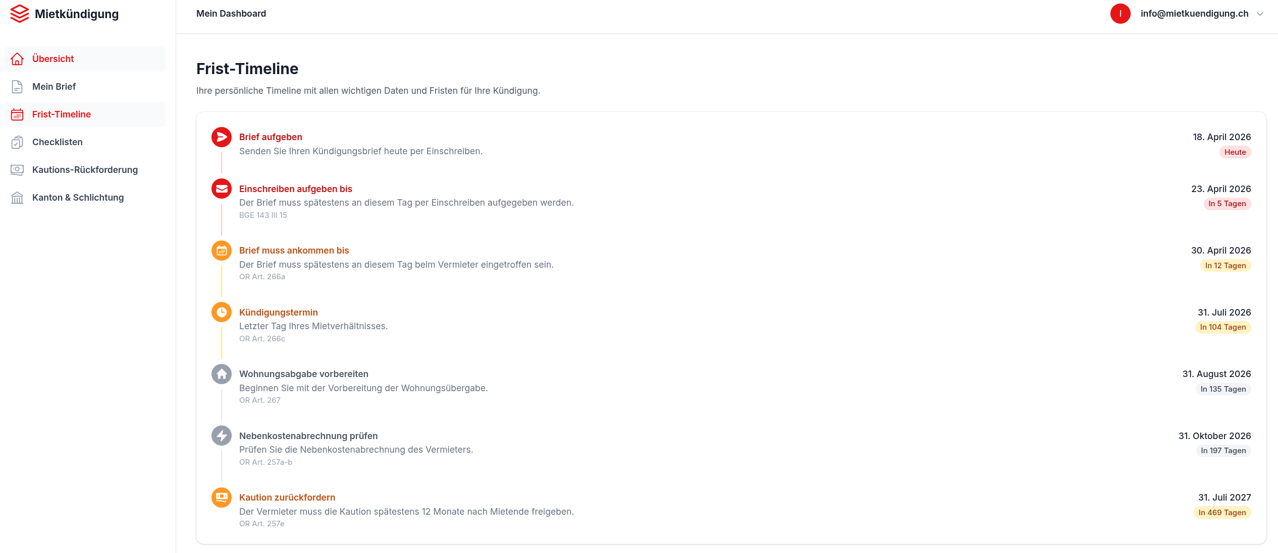 Use our free canton-specific deadline calculator. Select your canton, enter your desired move-out date, and get exact deadlines instantly.